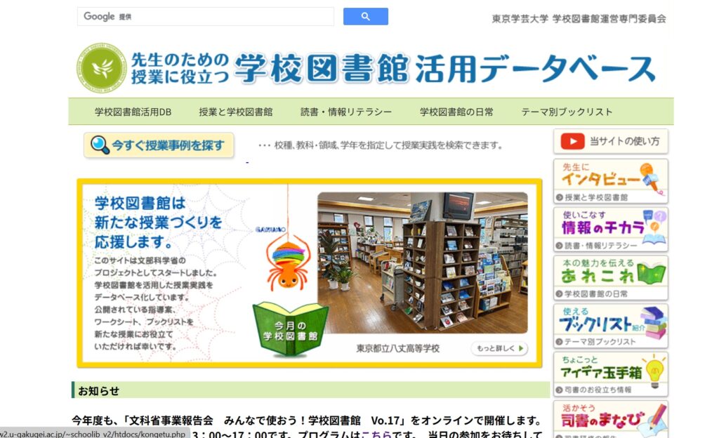 東京学芸大学学校図書館運営専門委員会が運営している「先生のための授業に役立つ学校図書館活用データベース」は、開設から17年目となりました。現在、このウェブサイトは、附属学校関係者だけでなく、学校図書館に関わる様々な立場の皆様にご覧いただいており、のべ350万件のアクセス数となりました。