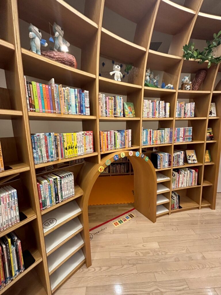 絵本のいずみというコーナー(写真左)では、本が溢れ出るような空間を意識していたり、お話しのトンネル(写真下)というコーナーでは、子どもが入りやすいような工夫と共に子どもの興味を存分にキャッチした本を配架していた。メルヘンの会というボランティアさんが制作した布絵本がある。旧館時の布絵本制作講座から誕生し、こども祭りなども手伝ってくれるそうである。